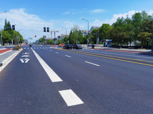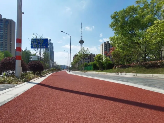 与沥青马路黑黝黝的面孔不同,施工方将非机动车道铺装为红色,并通过特殊设备加以处理,让车道不仅颜色靓丽,还具有耐磨、防滑的特点,柔软且略有弹性的骑行感受,将让居民出行的舒适性大大提升。