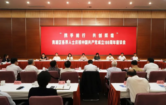 6月23日下午,青浦区政协和区委统战部联合召开“携手前行,共创辉煌”——青浦区各界人士庆祝中国共产党成立100周年座谈会,重温党百年辉煌历史,进一步团结激励各民主党派、各界人士与中国共产党同心同德、携手奋进,为推动青浦全面跨越式高质量发展迈入现代化新征程接续努力、再立新功。区委书记赵惠琴出席并讲话,区政协主席李华桂主持。区委副书记杨小菁,区委常委、统战部部长王凌宇,区政协副主席顾啸流、董永元、王海青、饶斐文以及历届政协老领导应名勇、张布尔、周德海、沈蕴新等出席。