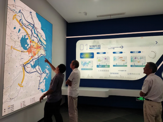 走进基地,党建引领、干部工作、人才服务新模式,以及在城市治理、生态绿色、重大项目、民生保障等方面的重要举措等都通过视频、图文模式一一展示出来。这是青浦、吴江、嘉善三地各级党组织和广大党员干部守初心、担使命,奋力将习近平总书记重要讲话和指示批示精神转化为示范区发展的生动实践和创新成果。在讲解员的带领下,直观回顾长三角一体化发展的历史脉络以及长三角一体化和一体化示范区推进过程中的重要节点、重大事件。一字一句、一帧一幕皆是三地携手发展的“结晶”。在这里,还可以乘坐模拟的示范区一路公交车,感受长三角一体化给三地百姓带来的实实在在的便捷性。