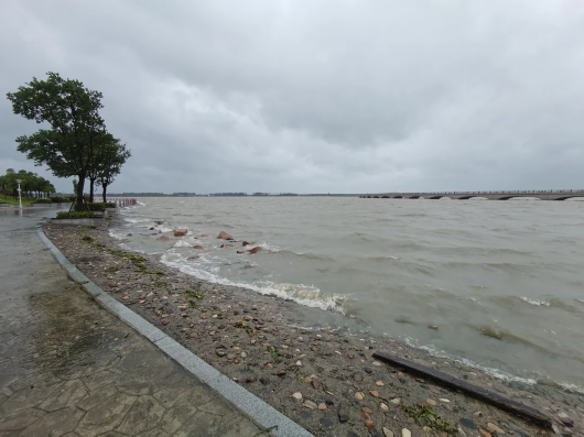 在淀山湖湖心岛,“烟花”带来的大风卷积着湖水,猛烈地冲向岸边拍打着堤防,溅起白色的水花,岛上的植物也被大风吹得在空中“摇头晃脑”。在台风登陆时,5名青浦区河湖管理事务中心巡查员来到淀山湖堤防进行巡检,全力保障淀山湖堤防安全防线。青浦区河湖管理事务中心河湖管理科科长胡谨显介绍:“为了确保第一道堤防的安全稳固,我们每天派出130余名巡查监理人员对堤防进行全线的巡检,每天巡检两次。”