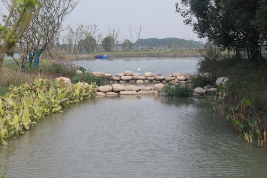 同时,将原有传统鱼塘改造成生态鱼塘,通过形态再造及净化功能分区,将生态鱼塘分为底栖动物滤食、非经典生物操纵、经典生物操纵三类。选取淀山湖水域及周边河湖的土著水生动物25种投放到相应的生态养殖区域,改变以往高密度低端养殖对水体的污染,促进水生态动物种群良性构建。良好的生态环境,引来大批白鹭栖息在此。