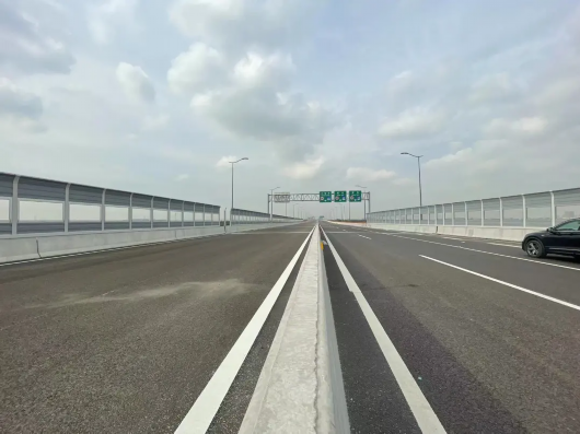 记者来到高架桥面上,工人正在进行声屏障施工和配套设施的安装。在工作人员的引导下,记者的车辆驶入部分高架路段,道路整体通行体验良好,车辆通过桥面伸缩缝连接处时没有明显颠簸感。