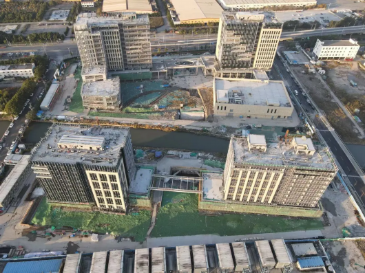 上海精测半导体技术有限公司研发大楼2019年底开工,项目占地约55亩,共有五幢单体建筑及配套设施,包含一幢2层洁净厂房、两幢11层研发办公大楼、两幢13层研发办公大楼及河下连廊等。目前,工作人员正在对其玻璃幕墙进行施工,同时室内精装修也在同步进行,预计明年6月具备交付条件。