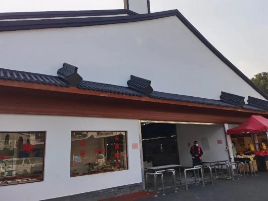 改造后的菜市场从外观上来看是白墙黛瓦、飞檐翘角的江南建筑。菜市场门口,是装修一新的熟食店和水果店。据菜场负责人介绍,原本菜场共有3个门口,疫情防控期间只开设一个,并每天由志愿者检测体温,提醒顾客戴好口罩。改造后的市场摊位整齐划一,功能分区清晰,以前又小又滑的地板砖更换成防滑的大理石,平整干净又防滑,摊位台面则按照市场标准化要求分类铺设成了瓷砖,摊位面积也在原来的基础上增加了一倍,每个摊位后面还新装了水池,菜场内还新增了8个高清监控设备,整个经营环境井然有序。“我们把菜场的外观和内部进行了一个整体的改建,屋顶进行了挑高,菜场更加宽敞和亮堂。地面进行了全部翻修,还重新安装了排水沟。改造中最受百姓肯定的是水产区排水沟和下水道的改造,以往积水的情况现在已经不复存在了。”商榻菜场负责人郑群华介绍道。