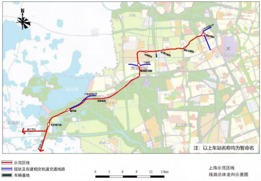 本次规划示范区线长约50公里,主要沿北青公路、外青松公路、沪渝高速、沪青平公路走行,设置8座车站,分别为芳乐路站、徐乐北路站、赵重公路站、华青路站、青浦新城站、朱家角站、西岑站和水乡客厅站(站名均为暂命名)。