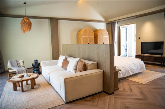 ▲宽敞的房间、雅致的布置,随着光影的变幻,记者将目光移至金泽商榻片区。2024年3月,沙港村首家民宿“容居·沙港”开启预运营。民宿主精心布置的房间,椅背上挂着的毛毯等细节,已为客人入住时能够享受农家小院的精致和幽静做下准备。