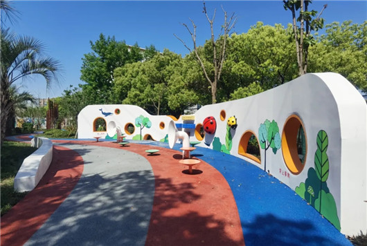 往里走是自然互动区,富有童趣的涂鸦景墙、可爱的座椅,增加了父母与孩子在户外的互动性,最后是乐活生活区,文化小品寓教于乐,与植被相得益彰。