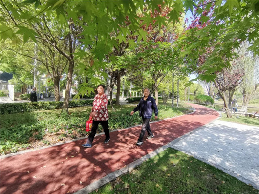 居民徐阿姨和徐叔叔从公园里走过,他们愉悦地表示道:“我们周边这样的小公园越来越多了,绿化很多,空气清新,是我们经常活动的场所,居住在这里幸福感不断提升。”