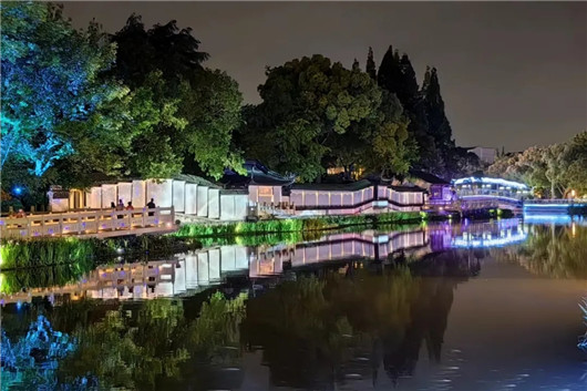 随着气温不断攀升,夜间散步游玩的市民游客日趋增多,青浦新泾路经过升级改造后,周边环境明显优化,成为附近居民休闲放松的好去处。光影交织的码头、如梦如幻的穿越卷轴、古色古香的曲水船市,以及《四时》纱幕投影的绝美画面,让这条原本静谧的护城河河岸焕发出新的生机与活力。