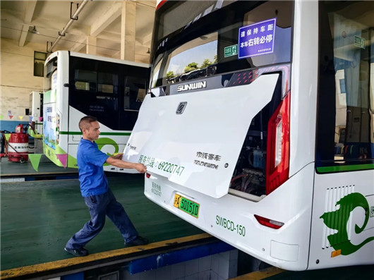 近日,记者在青浦巴士停车场内看到,维修技工正对车辆的胎压、传感系统、电池等进行基础的检查维修,特别是对车内空调滤网进行清洁和消毒,开展一系列的“洗肺”工作。检查结束后,驾驶员坐上驾驶位,熟练地开机检测制冷效果及风量是否达标,以保障车内环境卫生洁净。