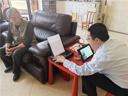 近日,华新镇社区事务受理服务中心接到陆象村蒋奶奶的“上门办”申请,工作人员带着“新装备”,把受理窗口“移动”到蒋奶奶家中,运用“新装备”,通过远程连线中心远程虚拟窗口工作人员,迅速完成取号、连线、信息读取、现场确认、评价等业务办理环节,仅用不到5分钟,就为蒋奶奶完成老年人助餐补贴的办理。随后,又赴朱长村为长期卧床的朱爷爷办理了长护险服务申请、赴金瑞苑居委为张爷爷办理了老年人助餐补贴。